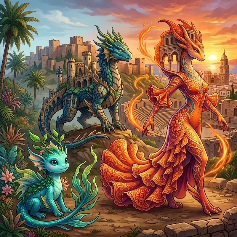 Create an image of a fictional creature and its two evolutions based in Málaga, Spain. The first, a small creature with aqua and green textures inspired by the beautiful Alboran sea, possessing plant-like features symbolizing the prolific botanical gardens in the city. Its first evolution shows growth in size, its features becoming more intricate with the appearance of castle-like elements, reminiscent of Alcazaba, a Málaga landmark. The final evolution resonates with the vibrant culture of Málaga, exhibiting flamenco-inspired pattern, embodying its historic Roman theatre and infused with orange hues representing Málaga's warm sunsets.
