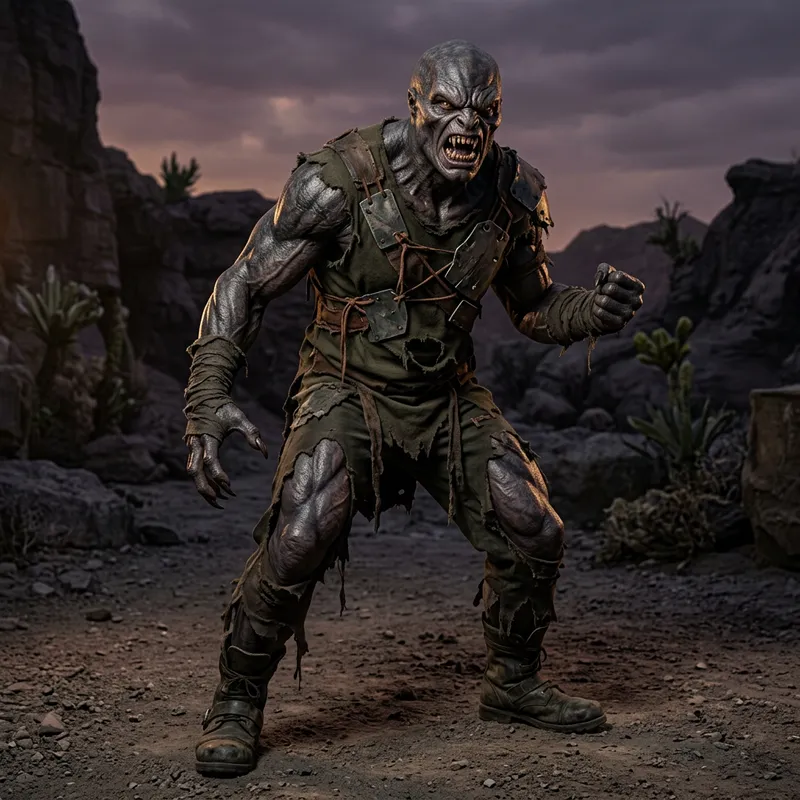 A full body depiction of a fierce humanoid alien creature. It has grey skin and an enraged expression with a mouth full of sharp teeth. Its clothes appear torn and ragged, adding to its fearsome appearance.