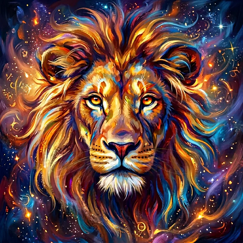 A visionary depiction of a lion's face, portrayed with intense, radiant hues and audacious brushwork. The lion eyes the viewer with a valiant expression, emanating a sense of power and regality. This is a fantasy-inspired piece, brought to life through the medium of digital painting; the artist uses gentle, sweeping brushwork to help create an air of mystique and enchantment.