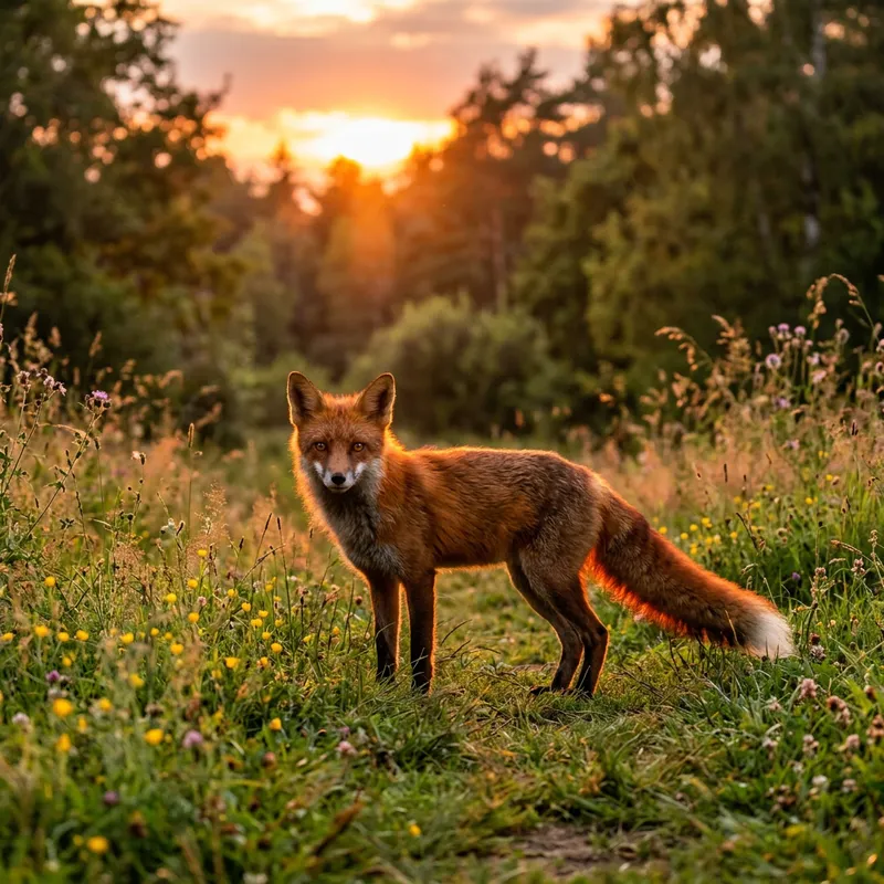 Visualize a red fox in the wild. It stands alert in the middle of a grassy meadow, backlit by the setting sun. Its fur appears fiery red as it catches the light, with darker markings around its face, legs and the tip of its sweeping bushy tail. Its sharp keen eyes reflect intelligence and curiosity. Leaves gently rustle in the surrounding trees, painting a quintessential wilderness scene.