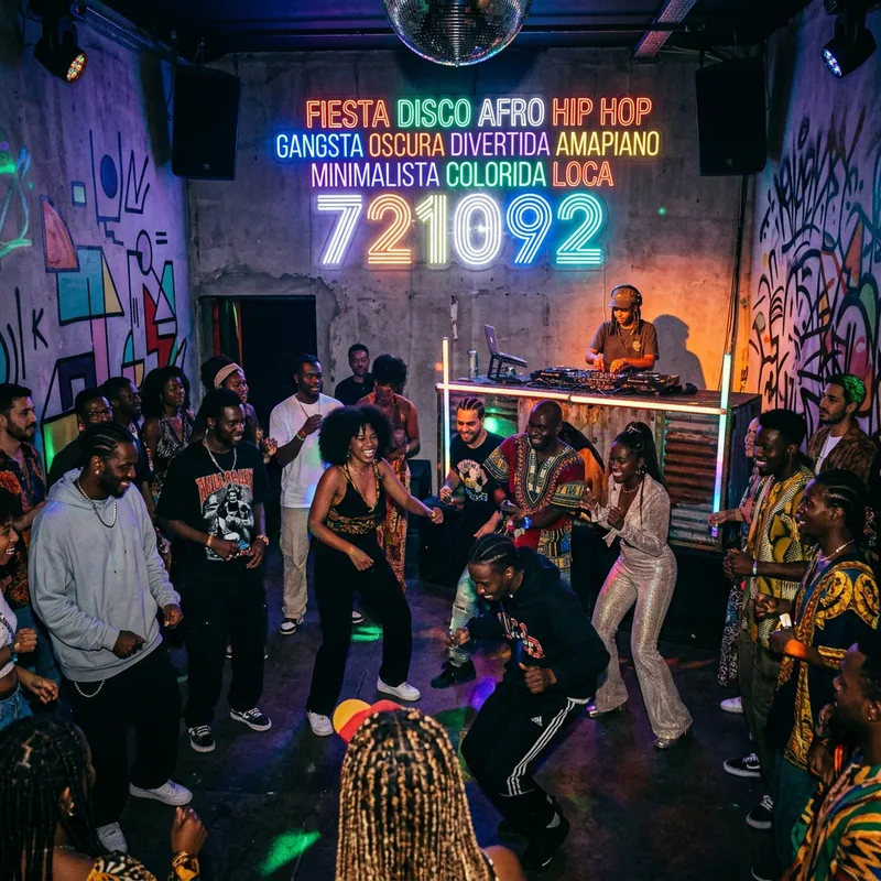 fiesta disco afro hip hop gangsta oscura divertida amapiano minimalista colorida loca