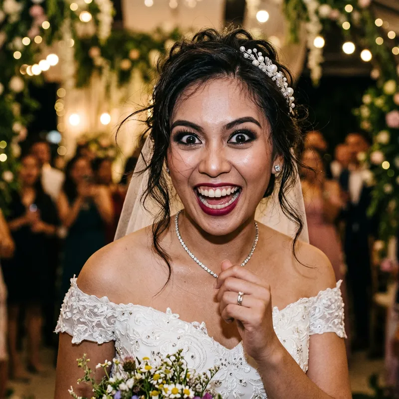 Close-up portrait of a Filipina bride in a white wedding dress. Focus is on her intense and wild eyes, communicating a sense of unpredictability and madness. The bride exudes a kind of eccentric flair, setting her apart from the stereotypical tranquil bride. Her vivacious energy, manifested through crazed eyes, captures an unconventional interpretation of wedding joy.