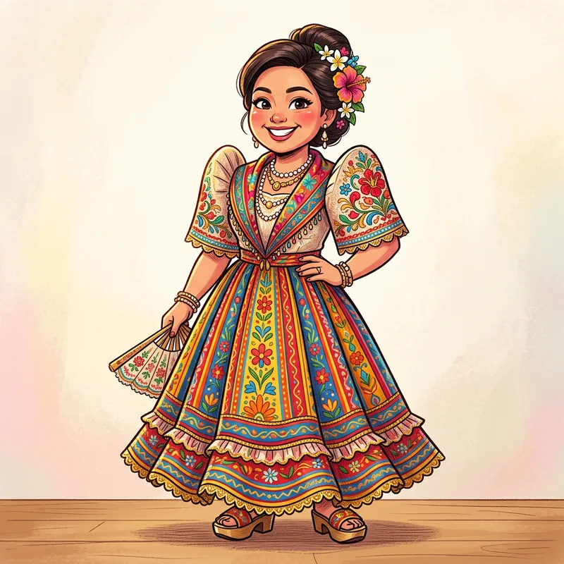 Create a colorful and vibrant full body caricature of a Filipina woman donning a traditional Saya dress. She should be standing confidently, radiating an air of happiness and pride. The woman should have medium length hair neatly styled, and her attire should be beautifully detailed, showcasing the unique elements of the Saya dress. Use a variety of colors and patterns to embellish the dress. The background should be plain and simple, so as to not distract from the main subject of the image.