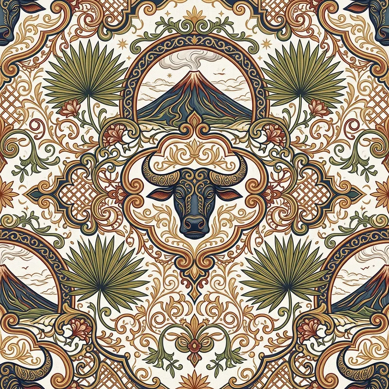 Create an image of a vector pattern inspired by the traditional Filipino barong. The barong is a lightweight, long-sleeved, embroidered shirt typically worn untucked, and is traditionally made from raw, hand-loomed cloth or colorful woven fabric. Display the pattern in swirling designs and intricate geometric shapes characteristic of the barong, including natural symbols such as the kalabaw (water buffalo), the banahaw (volcano), and the anahaw (leaf).