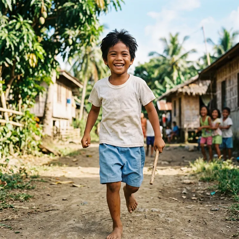 A photographic image of a young Filipino boy. He has medium skin tone and black, thick hair. His eyes shine with a lively spark while playing outside in the sunlight. He wears a simple, white cotton t-shirt and shorts that are traditionally worn in the Philippines.