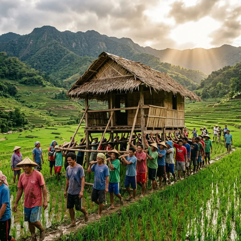 A group of farmers from the Philippines, demonstrating unity and cooperation, are working together to lift a traditional house from the emerald green expanse of a rice field. Sun rays break through the cloudy sky, casting a warm light onto the scene. The men and women farmers, with diverse ages, are giving it their all. Backdrops of lush rice terraces and distant mountainous landscape paint a rural Filipino setting.