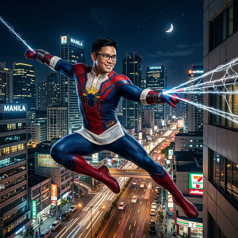 A well-built Filipino man, dressed as a superhero known for having the abilities of a spider. The man has black hair, glasses, and a traditional Barong Tagalog beneath his costume. Spider webs shoot forth from devices on his wrists as he leaps confidently across a cityscape at night.