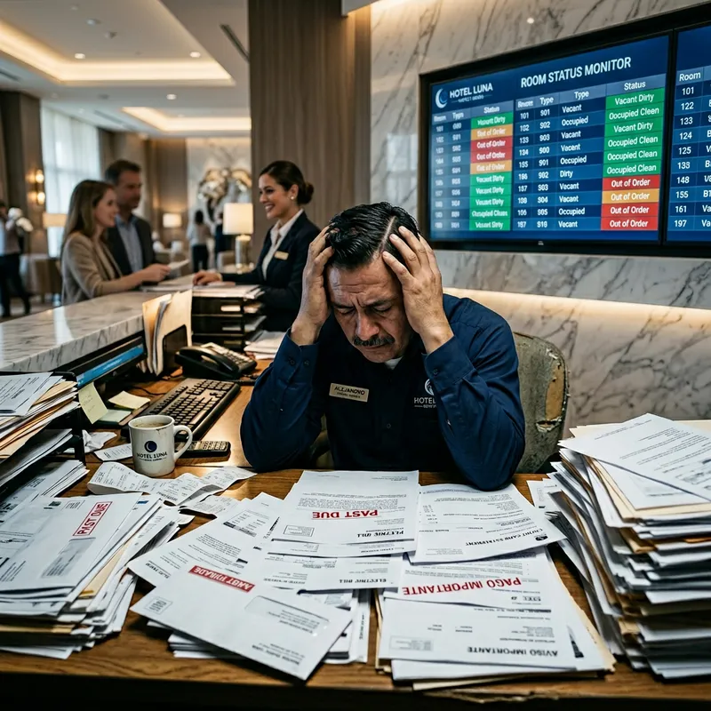 A middle-aged Hispanic male, working as a hotel employee, can be seen at his cluttered desk, submerged under towering piles of unpaid bills. Wearing a neatly pressed uniform, he's seated at his wooden desk, anxiously rummaging through the sea of paperwork. His head is weighed down by despair, hands clutching his neatly parted hair, showing the visible signs of stress. His worried expression and furrowed brows effectively echo the growing insecurity of his already stress-ridden job. A noticeable melancholy in the dimly lit room portrays a stark contrast between his high demand profession and the staggering financial burden he carries.
