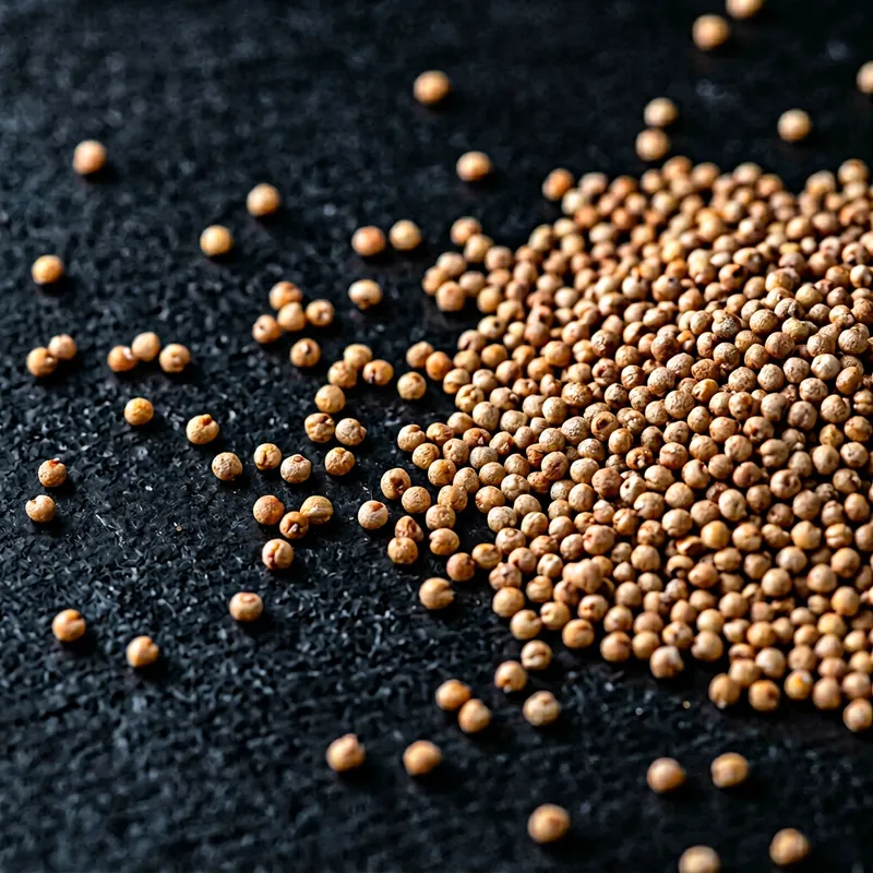 A highly detailed image showcasing finger millet, a nutritious grain, prominently displayed against a contrasting black background. The tiny, sphere-shaped grains are of a beige color, subtly glimmering in soft light. Some of the millet grains are scattered loosely, while others are grouped, demonstrating their natural clustering. The dark background serves to make the millet granules stand out, highlighting their unique texture and irregular contours.
