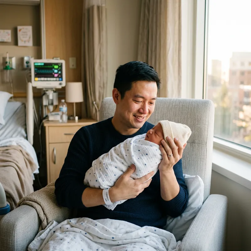 A depiction of a man experiencing becoming a father for the first time. He should be East Asian, in his early thirties, with black hair. He is holding a newborn baby with wonder and awe. The setting is a well-lit, cozy hospital room with gentle colors and a comfortable chair where the father is sitting. In the background, there should be a window with morning light streaming in, adding to the warmth of the scene.