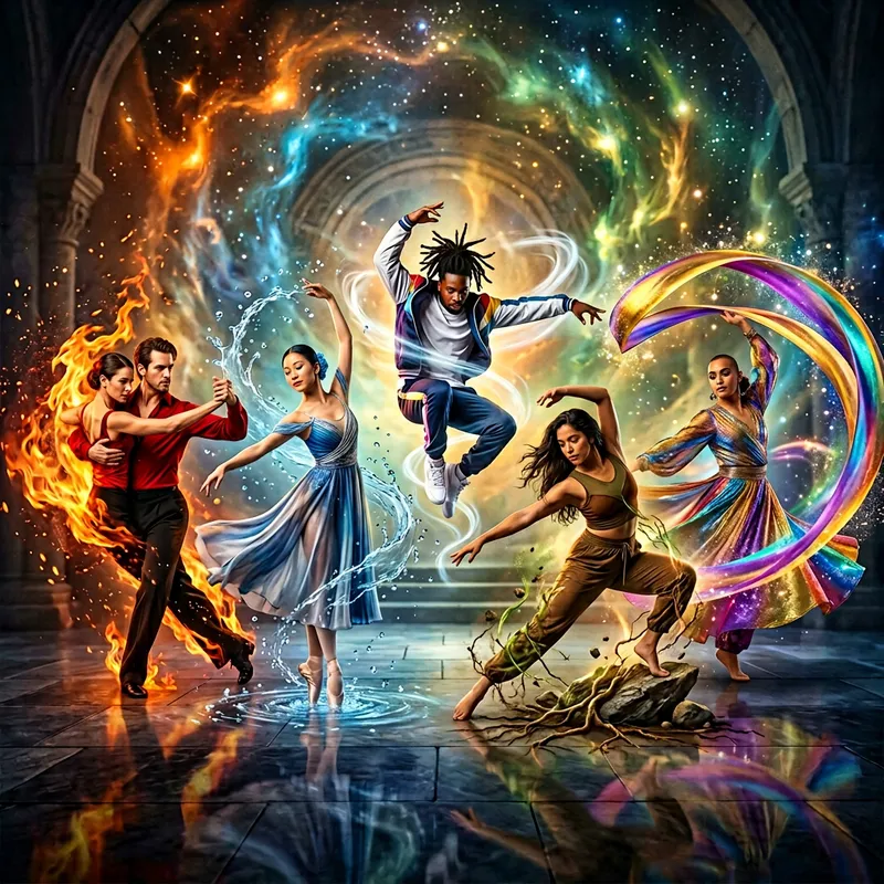 An artful representation of five dancers, each embodying one of the five elements. Each dancer has a different descent and gender. One Caucasian male performs a fiery, passionate tango to represent the element of fire. An Asian female performing ballet exudes the tranquility of water. An African male executes a vibrant hip-hop routine embodying the element of air. A Hispanic female illusion of earth through a slow, grounded contemporary dance. Lastly, a Middle-Eastern person of non-binary gender performs a whirl of colors with a ribbon dance, representing the element of Spirit or Aether. The scene is ethereal and breathtaking as all dances blend seamlessly, akin to the harmony of elements in the ecosystem.
