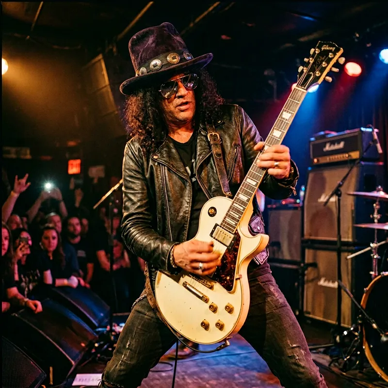 A Les Paul guitar styled in flamenco white, held by a skilled musician with dark, curly hair and a lean physique. He is caught in the midst of playing an intense, emotive guitar solo, fingers nimbly flying over the fretboard, creating resonant melodies that fill the room. The musician's attire is emblematic of classic rock: a top hat adorned with silver conchos, a nostalgic nod to the past, a pair of oversized aviator sunglasses that shield his eyes, and a tight-fitting leather jacket that highlights his athletic build. Note that this image does not depict any specific real person or celebrity.