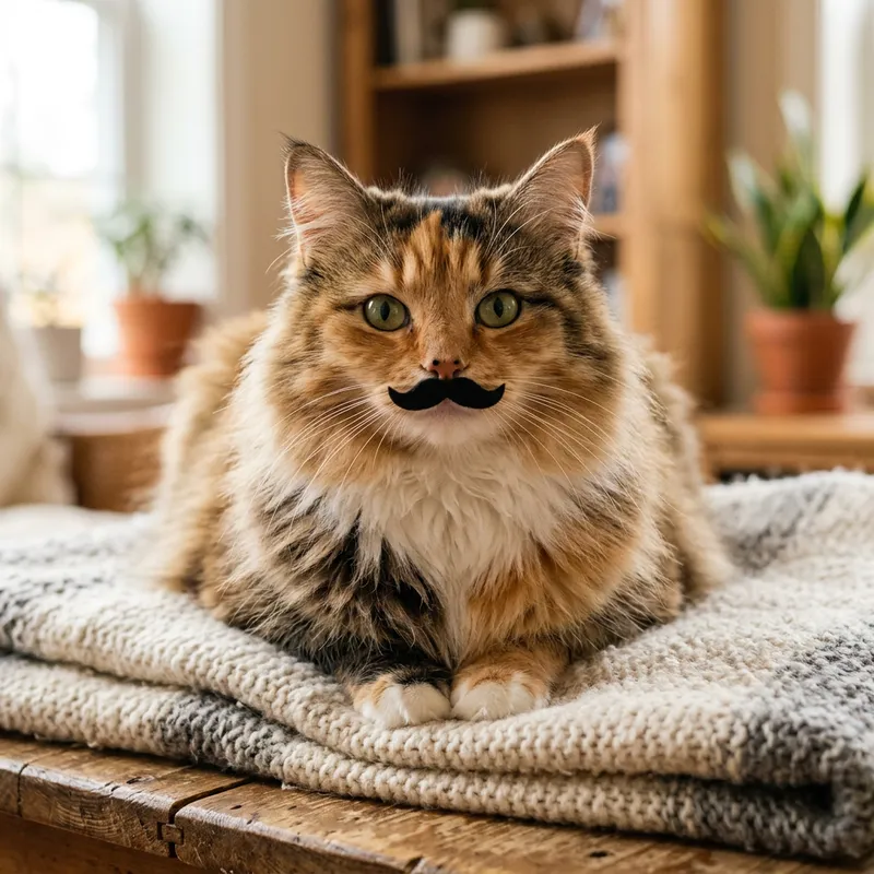 Generate an image of a fluffy cat wearing a generic, small and black mustache