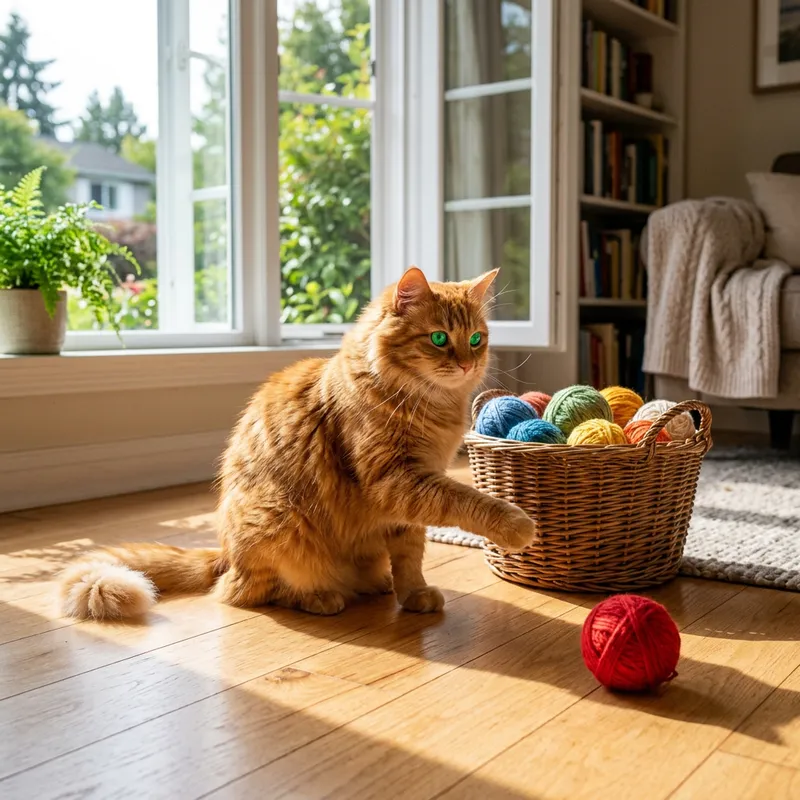 A detailed scene of a fluffy orange tabby cat with emerald-green eyes comfortably seated in a sunlit room. The floor is made of light hardwood, and there's a basket of colorful yarn balls nearby. The cat is curiously reaching out a paw towards a bright red yarn ball that has rolled a little way away. The warm sunlight streams through a nearby open window, casting interesting patterns of light and shadow across the room and the cat, adding depth and vibrance to the ambiance.