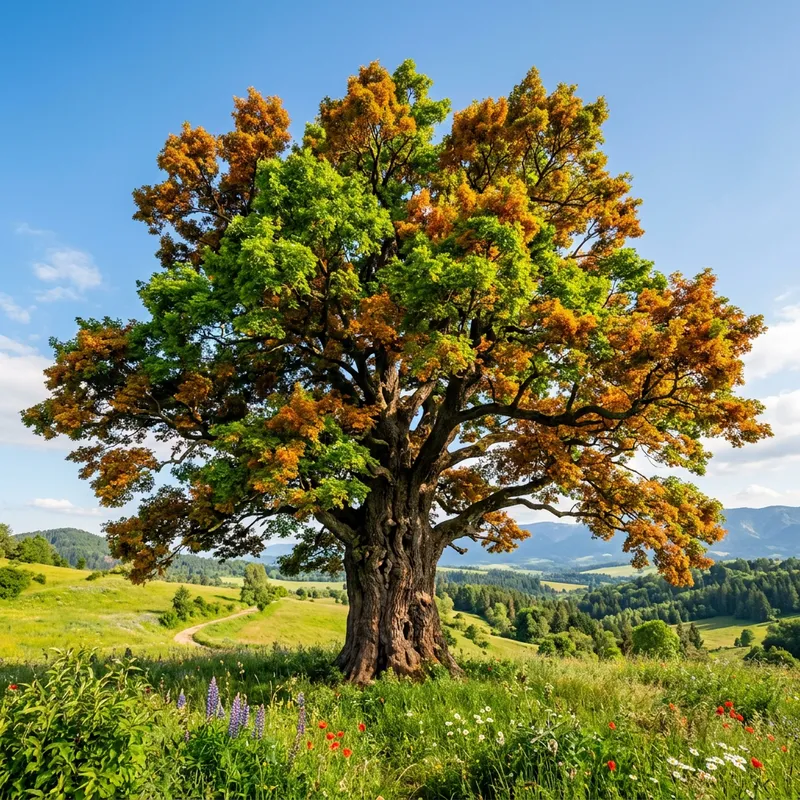 A beautiful tree in full bloom. It's radiating with vitality and strength. Its branches are thick and sturdy, reaching far and wide. The leaves are dense and fluffy, giving it a unique, bushy appearance. They range in color from a vibrant, summery green to a deep, autumnal orange, like a sunset captured in the canopy of the tree. The bark is rugged and thick with a deep brown color, showing the age and resilience of the tree. Intricate patterns can be seen on the bark, each unique, like a tree's fingerprint. The tree stands tall and magnificent on a lush, green hillside under a clear, bright blue sky.