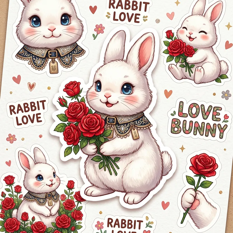 Create stickers of a fluffy, white rabbit, with big blue eyes holding a handful of vibrant red roses. The cute rabbit is wearing a smart collar with intricate designs, similar to the style of a Wenta Close collar.