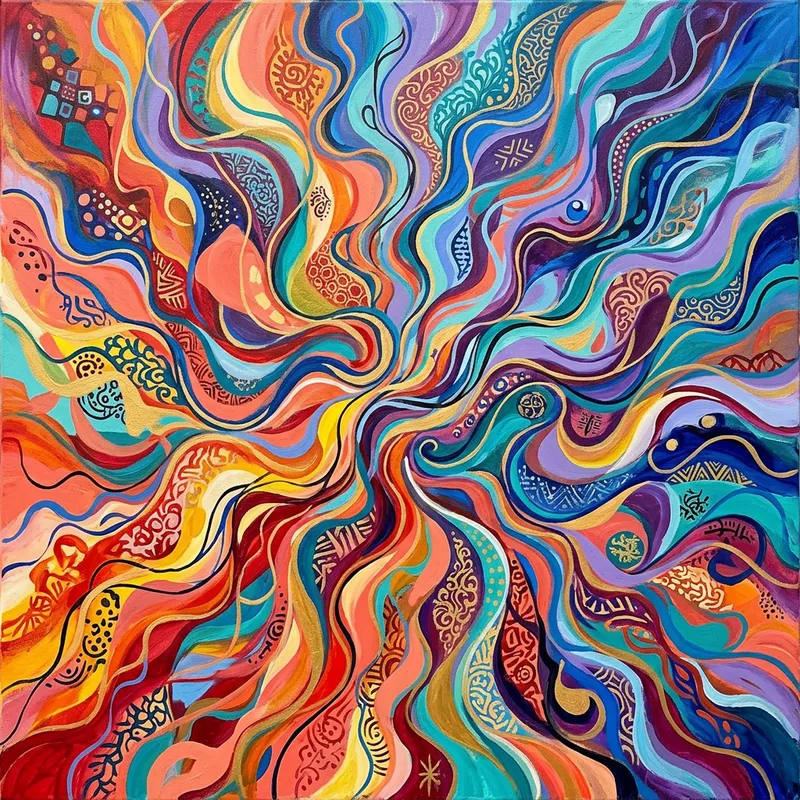 An abstract representation of diversity, showcasing a multitude of varying colors, shapes, and lines converging to form a harmonious and vibrant image. The colors include a broad spectrum ranging from warm reds and oranges to cool blues and purples. The shapes are fluid and dynamic, undulating across the canvas in intriguing patterns. The lines are wavy and sinuous, knitting the varied elements together. Unique patterns and motifs are scattered throughout, symbolizing the multiplicity of experiences that contribute to diversity.
