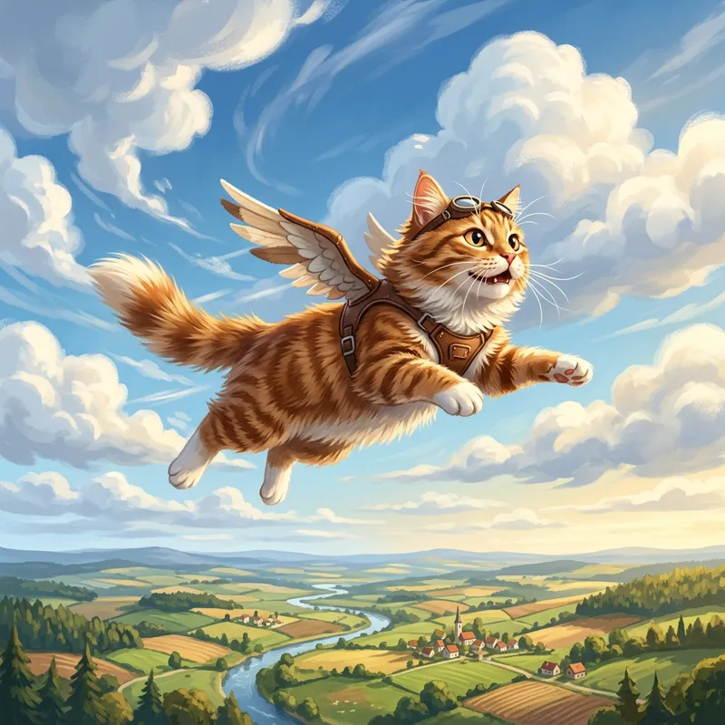 A depiction of a whimsical scene where a feline, more commonly known as a house cat, is shown engaged in an unlikely feat: flying. It may be sporting an expression of surprise or concentration on its furry face. The background could be an open, cloud-dotted sky, emphasizing the unusual situation of a domestic cat soaring high in the air like a bird.