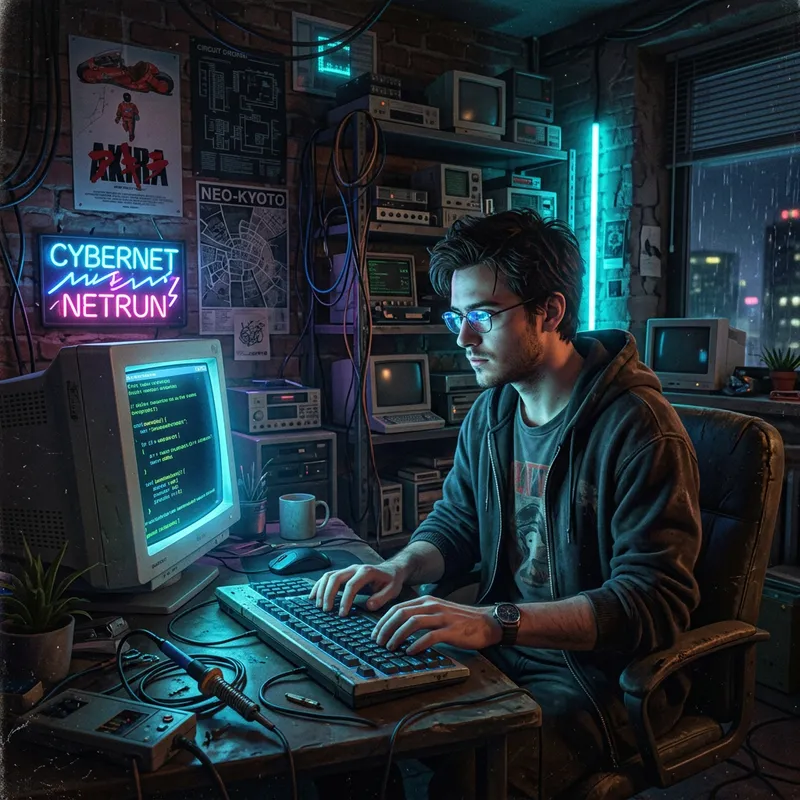 Digital Painting of a Focused Young Man in a Cyberpunk Setting