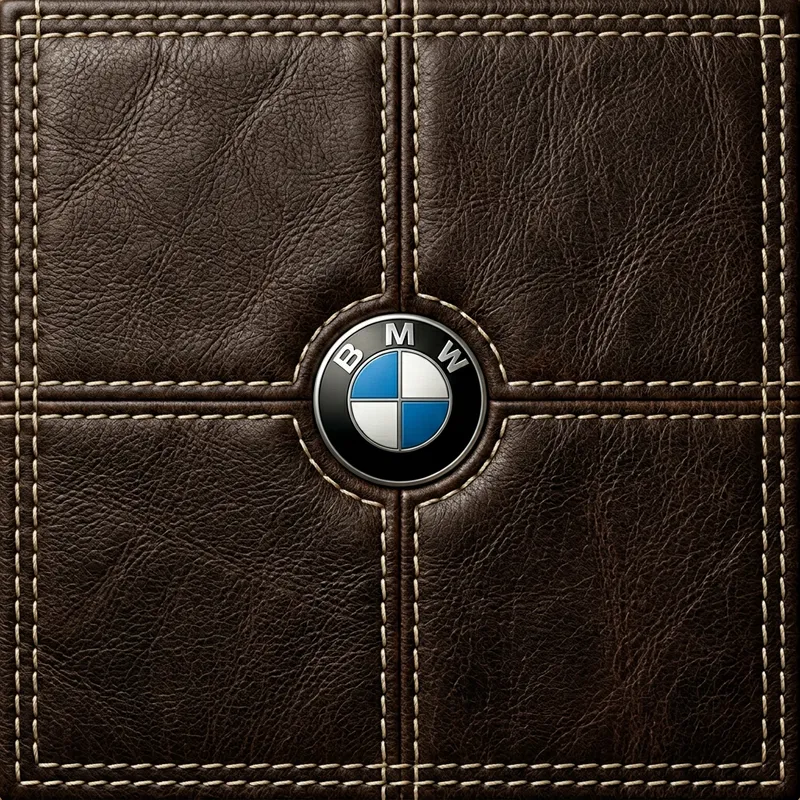 Wallpaper for PC in brown leather with stitches and the BMW logo in the middle.