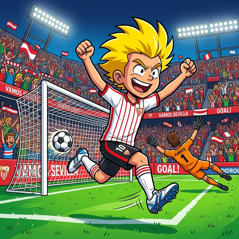 A cartoon character with spiky yellow hair, dressed in a white and red striped football kit, is jubilantly scoring a goal. The character is seen with a determined, focused expression. The football kit he is wearing aligns with that of a popular team from Sevilla, featuring red and white stripes on the jersey, black shorts, and white socks, complete with comfortable athletic shoes. The backdrop includes a packed stadium, with fans excitedly cheering on from the stands, and a vibrant green football field. Also, the opposing goalkeeper is shown leaping but failing to stop the goal.