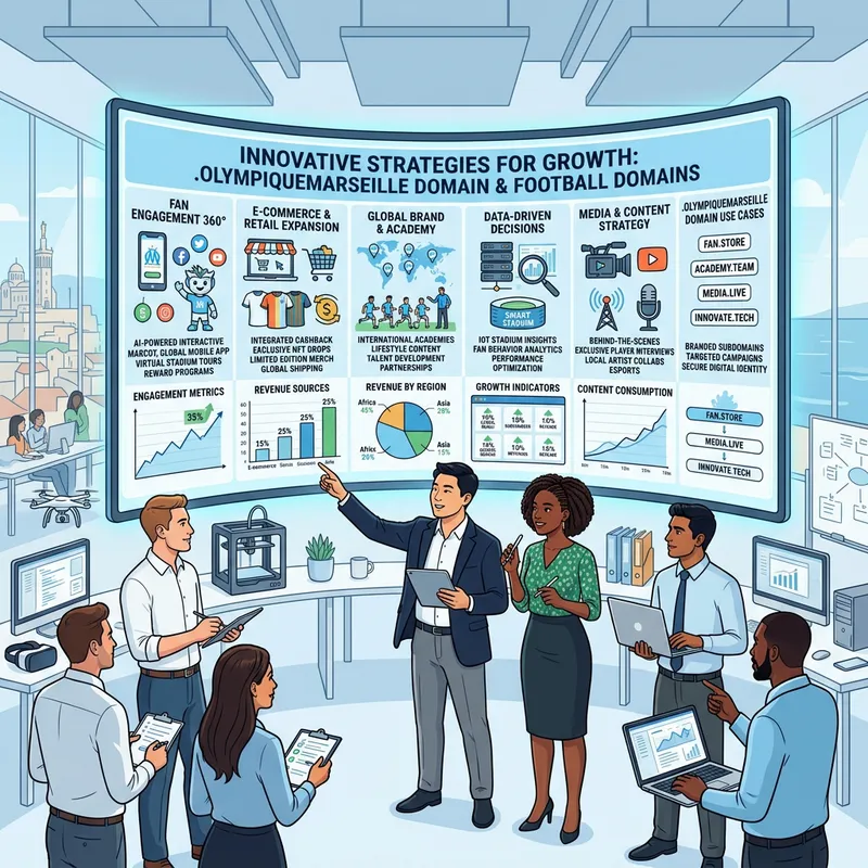 A vector illustration of a screen displaying a breakdown of innovative strategies for growth related to football domains, specifically focusing on instances related to the .olympiquedemarseille domain. Include charts, graphs, and growth indicators on the screen. As a foreground element, feature a diverse group of professionals discussing the strategies, with a male of East Asian descent and a female of African descent in prominent roles within the discussion. The setting should convey a modern, tech-oriented workspace, complete with computers, innovative tech gadgets, and an open, cooperative environment.