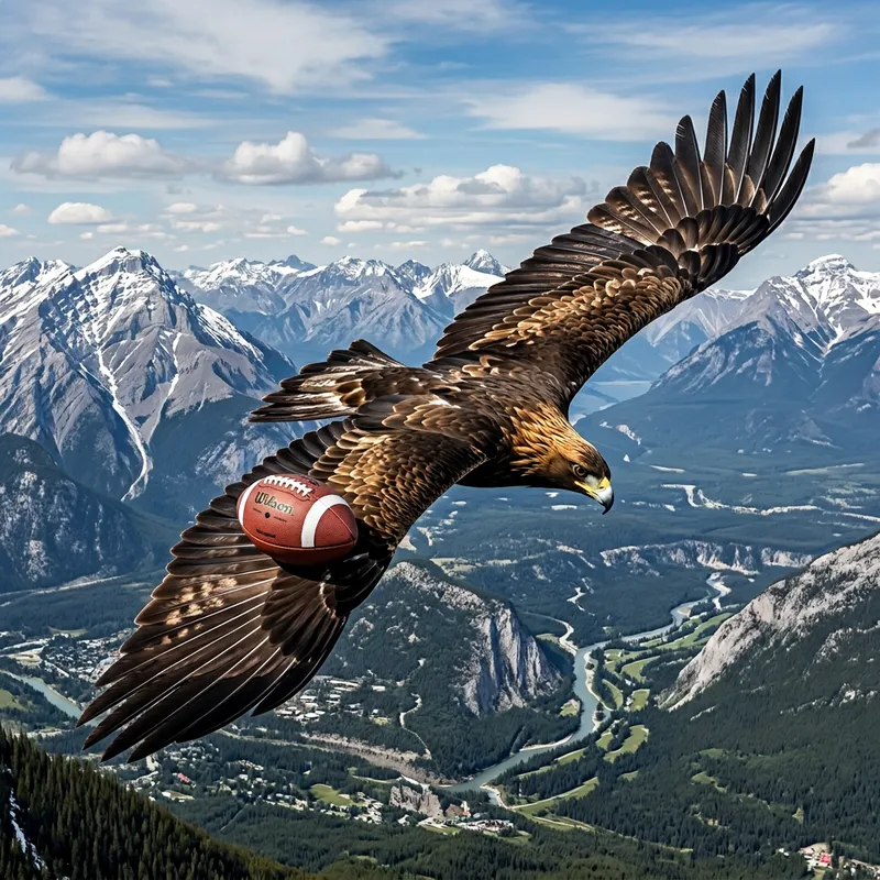 An image of a football resting on the wing of an eagle, where the eagle is high above, looking down at the ground.