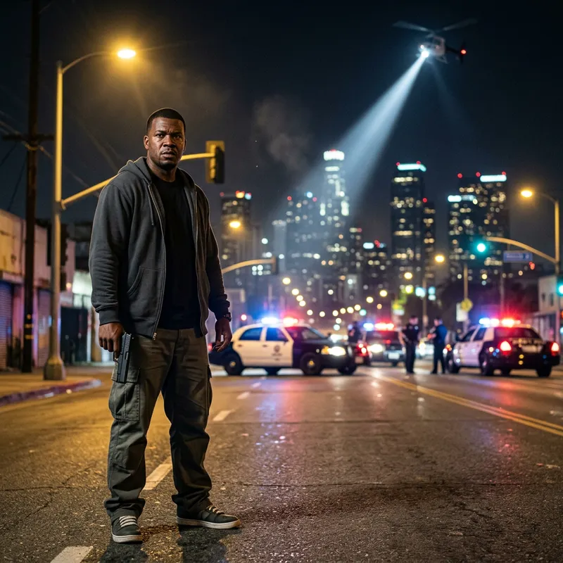 Franklin from GTA V holding a gun, cinematic pose, standing in the foreground, detailed Los Santos city background with police cars, sirens flashing, helicopter light from the sky, night time atmosphere, ultra realistic, sharp focus, perfect for YouTube thumbnail.