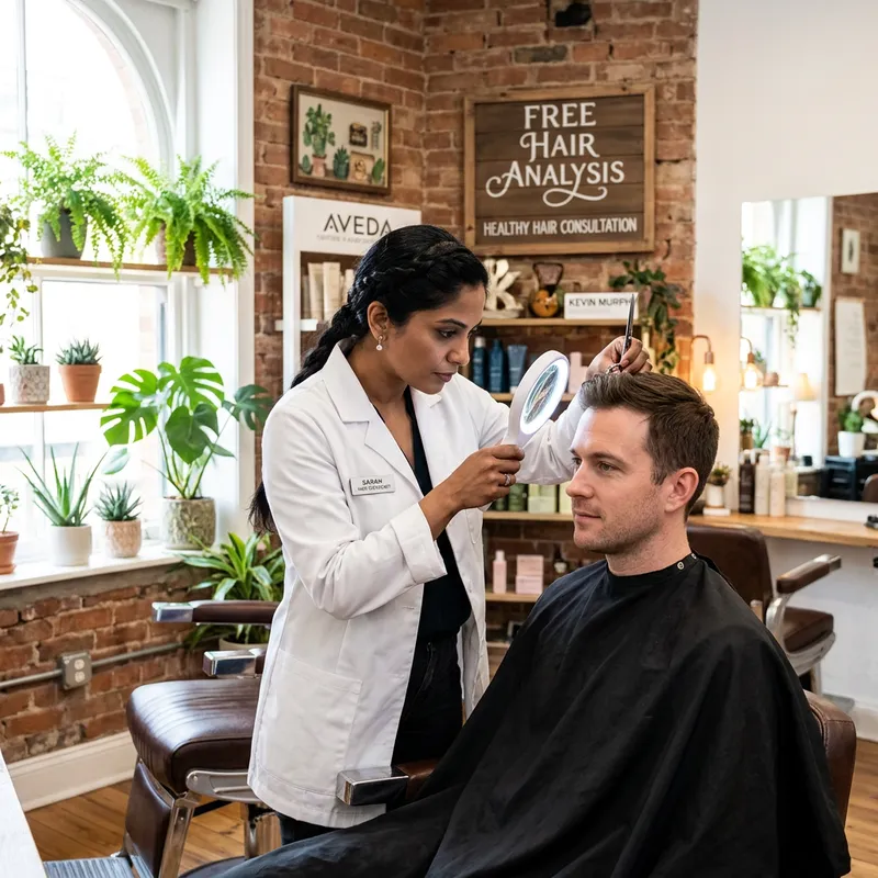 Visualize a professional hair salon scene consisting of a South Asian female hair stylist wearing a white lab coat with scissors in her hand and a magnifying glass. She is absorbed in examining the hair of a Caucasian male client sitting on the salon chair, surrounded by a stylistic blend of modern and vintage decor. The salon environment is clean and bright, with daylight streaming in from a large window adorned with green plants. A signboard in the background reads 'Free Hair Analysis', underlying the salon's commitment to ensuring healthy hair for its clients.