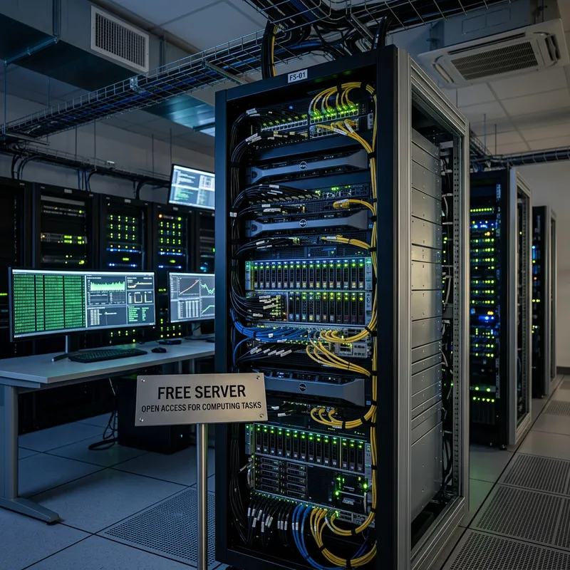 A computer server located in a well-ventilated server room. The metallic server stacks are meticulously arranged with numerous cables neatly organized. Blinking LED lights indicating their active status. A plaque in front reads 'Free Server', representing its open accessibility for various computing tasks. The room is bathed in an ethereal glow from the servers and monitors displaying complex binary codes and graphs. Overall, the atmosphere is high-tech, emphasizing the advance in modern technology.