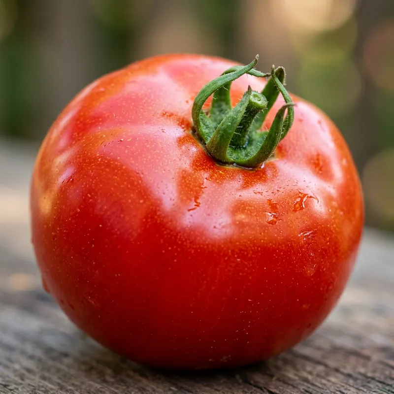 An up-close view of a ripe, juicy tomato. Visualize its bright red outer skin gleaming under the light. Focus on its smooth and slightly bumpy texture. Imagine the fresh, green stem proudly attached to its top, a testament to its organic and fresh origins. A reflection of light seen on the surface, further enhances the visual appeal. The contours of the tomato are perfectly round overall, but not without the typical small irregularities seen in nature. The background fades into oblivion, drawing the viewer's full attention to the majesty of the tomato.