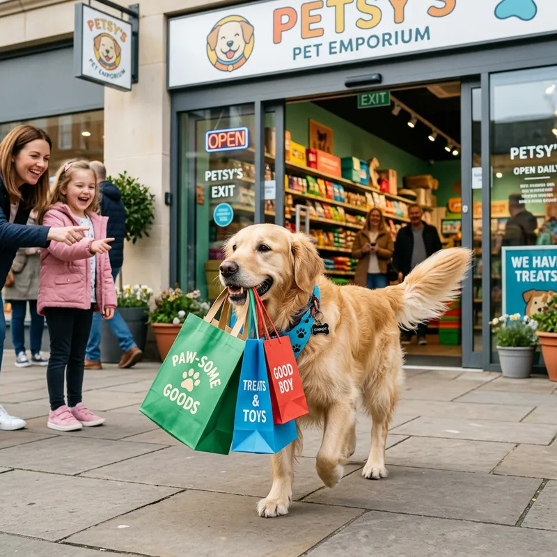 Create a photorealistic image of a friendly-looking dog shopping in a store. The dog is now exiting the store, carrying shopping bags in its mouth. The image should be kid-friendly and induce a sense of fun and laughter.