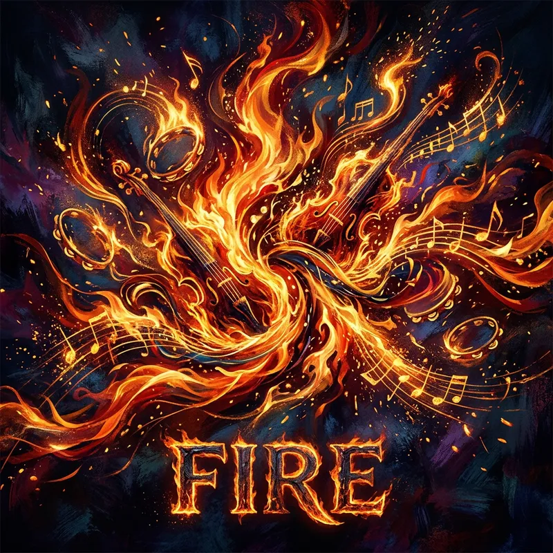 The flamboyance of gypsy music intertwined in an image, without any human figures, all very abstract. The image is titled FIRE