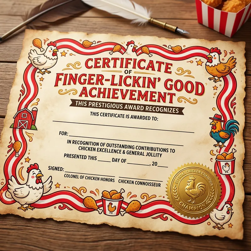 An amusing certificate designed with a theme reflecting a popular fast-food chain known for its chicken. The certificate is ornamented with cartoonish images of chickens, wavy stripes in red and white, and a securely embossed gold seal at the bottom. The paper appears to be of high-quality parchment. There are spaces for text, but they're currently left blank.