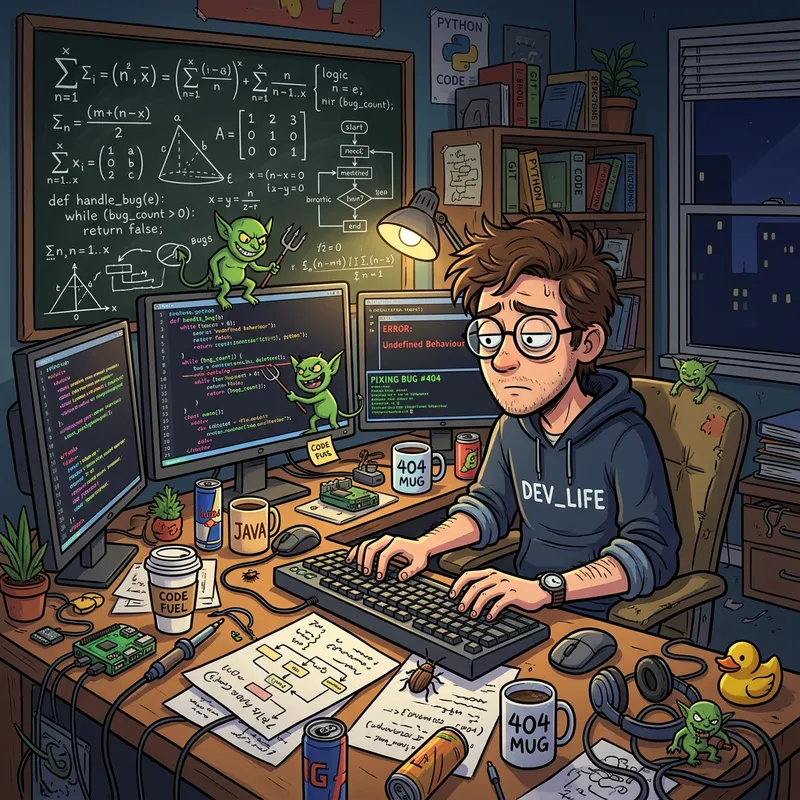 A cartoon depiction of a software developer hard at work. They are sitting at a large desk filled with multiple screens, typing away on the keyboard. The desk is cluttered with coffee cups, papers and tech gadgets. Behind them, a chalkboard filled with complicated mathematical formulas and software code. They are wearing spectacles and their hair is a bit disheveled, indicating a long workday. Around them, there are humorous elements symbolizing common software bugs, such as a literal insect or a small gremlin.