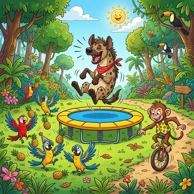 Create a scene featuring a laughing hyena clumsily jumping on a trampoline, while a group of silly parrots are attempting to juggle pineapples nearby. A playful monkey is also trying to balance on a unicycle whilst wearing a colorful polka dot waistcoat. This hilarious scenario is taking place in a vibrant, sunny, and cartoonish forest clearing.
