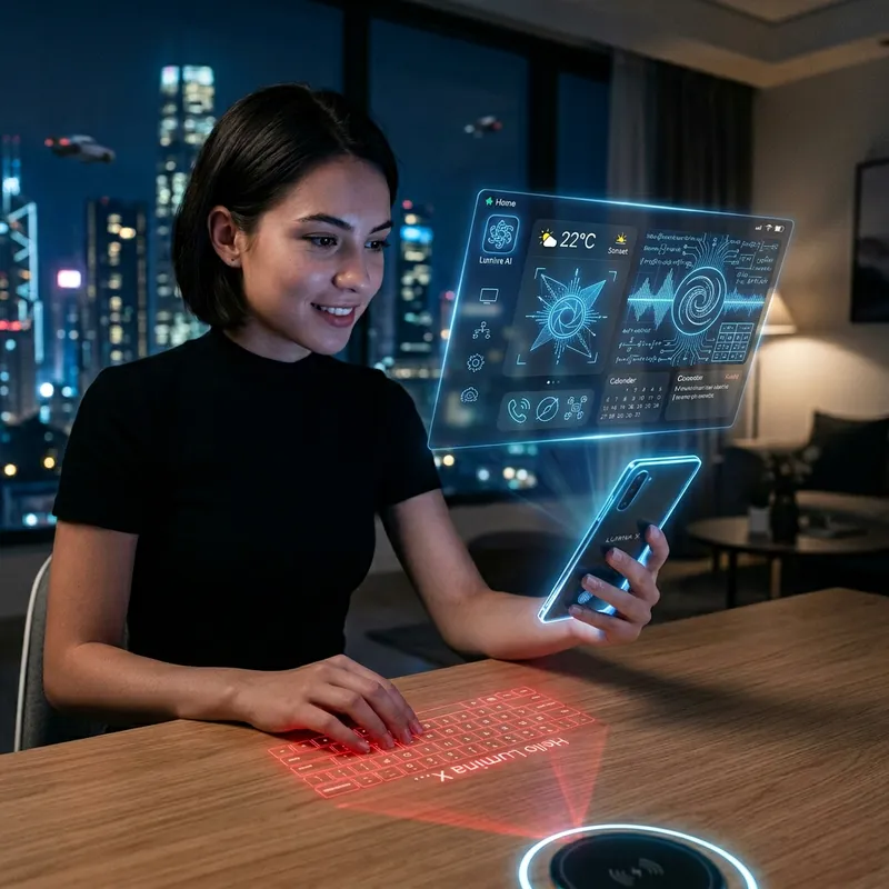 Imagine the future of mobile phones. The design is sleek and slim with a seamless glass surface. It's luminous, the holographic display emitting a soft glow. The hologram screen projects high definition images into the air above the device. Features could include a voice-activated AI assistant, an integrated projector for full-size keyboard typing, and advanced biometric security measures. The surround sound system might be so advanced that you feel as if you're in a concert when you play your favorite song. It charges wirelessly within a short radius of a power source, which eliminates the need for cables.
