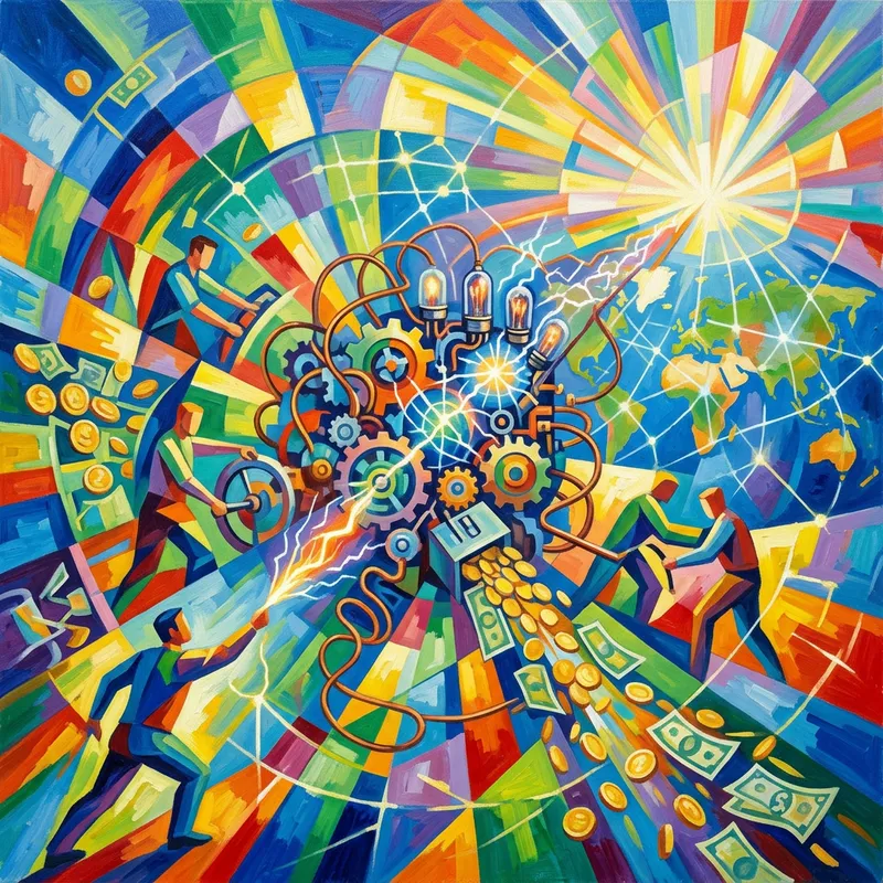 Abstraction of earning income on the internet. Incorporate the aesthetic of digital artistic techniques prevalent before 1912 with bright hues and geometric forms. The composition should be dynamic, providing a feeling of forward momentum and a sense of the future. Include elements that symbolize work, productivity, and digital technology.