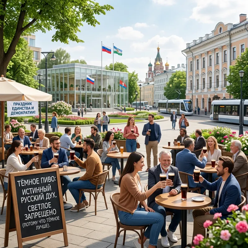 Draw an image of Russia in the future where full democracy is in place and the rights of all people are observed. The country is prosperous and the surroundings are beautiful. Light beer has been banned because dark beer is much better and carries MORE OF THE RUSSIAN SPIRIT.