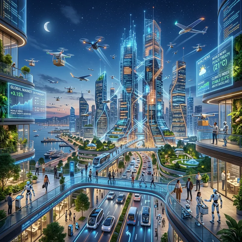 An image depicting the world of the future as envisioned by advanced neural networks. Skyscrapers made of complex algorithms touch the skyline. The streets are bustling with autonomous vehicles. Robots coexist with humans, carrying out various tasks. Large screens display real-time updates on world news, weather, and stock market trends using data-driven forecasts. The cityscape is beautifully lit, reflecting the blend of technology and life. In the sky, drones delivering packages can be seen alongside solar-powered aircrafts. Deep learning systems provide innovative solutions for climate change, rendering the city environmentally sustainable. The image embodies a utopian vision of AI development.