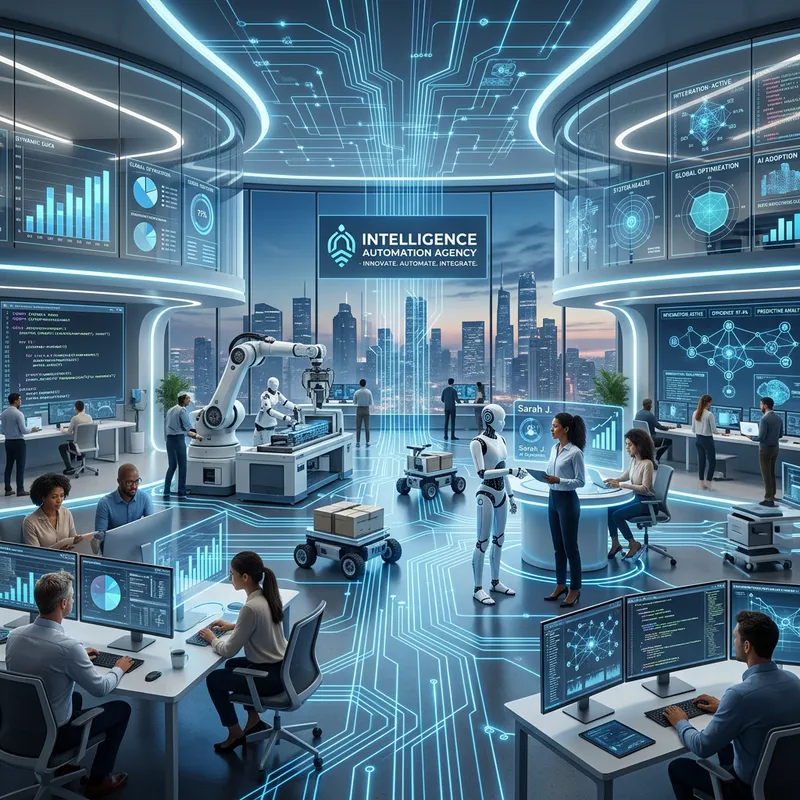 Create a detailed and vibrant picture that captures the essence of an Artificial Intelligence Automation Agency. The picture should visually represent key themes of innovation, efficiency, and seamless integration of AI technologies into various industries. It should include elements of futuristic automation, such as AI-driven robots of different shapes and sizes, interconnected networks represented by a complex yet harmoniously flowing web of lines, and advanced technical interfaces filled with holographic screens, radars, bar graphs, pie charts, and code running in the background. Use a palette of cool blues, grays, and whites to evoke a high-tech, futuristic feel.