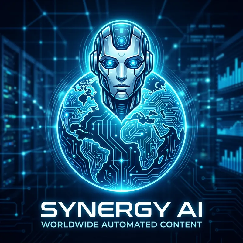 Futuristic AI Logo A sleek robotic head or futuristic AI face with glowing digital elements. A circuit-inspired globe to represent worldwide automated content.
