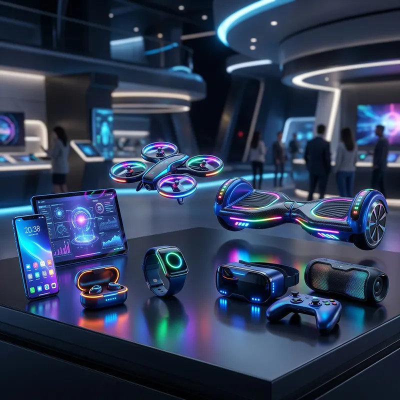 Imagine a collection of futuristic products, characterized by a sleek and contemporary design. These items are primarily in shades of deep blue and black, giving them a distinctly modern appeal. They are enhanced with vibrant LED lights, giving off a bright and energetic atmosphere. The LED lights flicker and shine in multiple colors, bringing the objects to life. The products range from gadgets like smartphones and tablets, to transportation devices like hoverboards and drones. These products represent the cutting edge in technology, imbued with a sense of the future right at this moment.