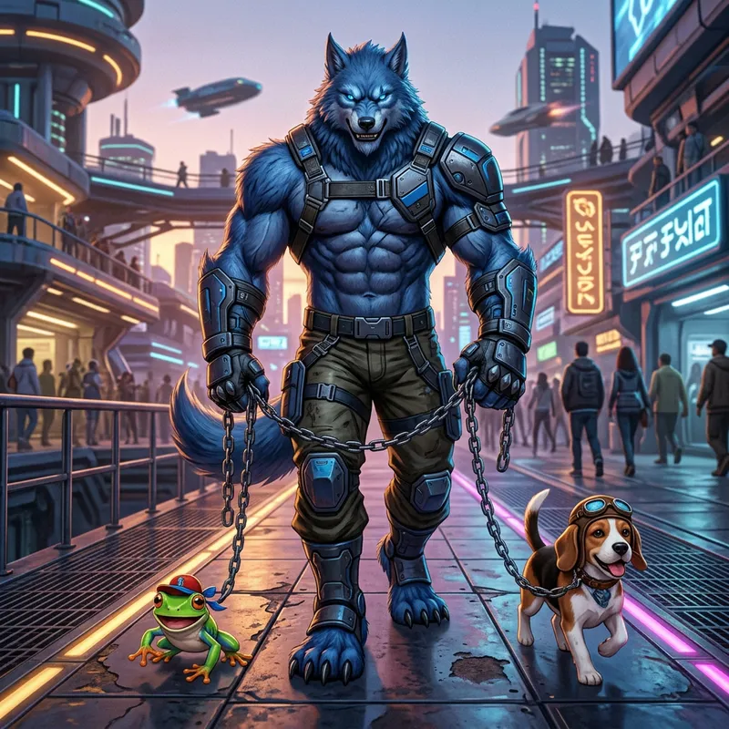 A strong blue werewolf with futuristic clothing takes a commanding stance, showing his muscles. He is holding chains that are attached to his novel pets: a charming frog and a cute dog wearing a hat. The image portrays the werewolf's dominance, but the pets seem unbothered and adorable. They walk around happily under his supervision.