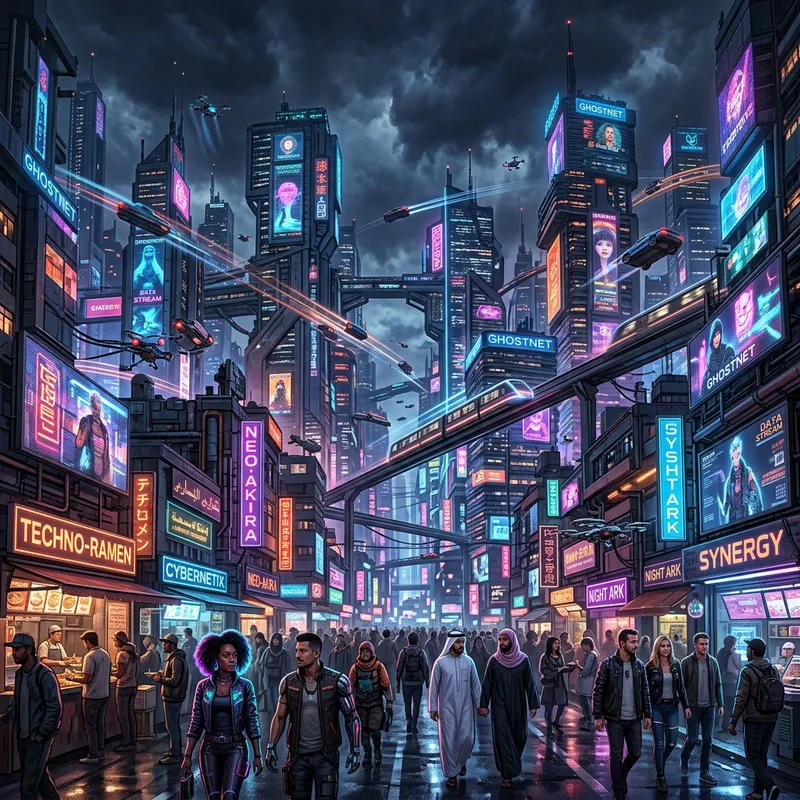 Envision a futuristic cityscape with cyberpunk aesthetics. The skyline is dotted with skyscrapers featuring high-tech neon signs and screens. The architecture favors asymmetrical shapes and lines. Streets are busy with monorails, flying cars and drones that add a dynamic layer to the urban chaos. The sky is filled with clouds reflecting the city lights, creating an atmospheric contrast. People can be seen walking on the streets and interacting in their daily urban lives, showcasing the multicultural aspect of the city. Both men and women from different descents such as Middle-Eastern, Caucasian, Black, and Hispanic are included. The overall palette of the city is rich with neon hues, creating an inviting, yet dystopian ambiance.