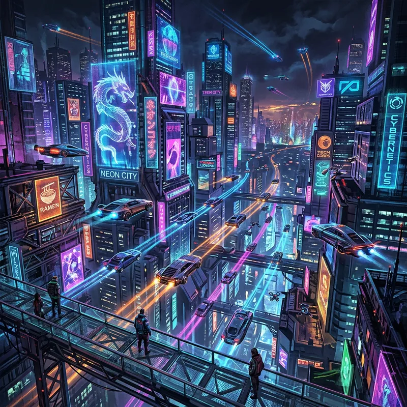 Futuristic Cityscape of Flying Cars and Neon Lights