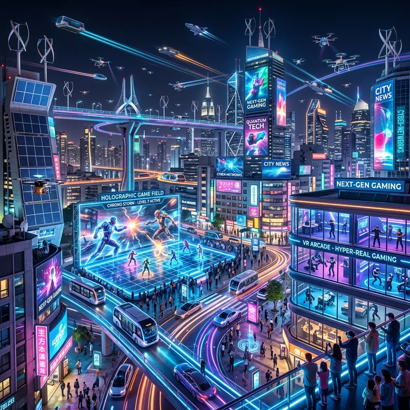 Envision a scene of a vibrant and futuristic cityscape teeming with advanced technology. Fill this city with high-tech buildings featuring renewable energy sources, such as solar panels and wind turbines. Nestled among the spaceships and hovercars, let's see areas that are dedicated to innovative game design elements, like virtual reality arcades and holographic game fields. Roads and pedestrian walkways glow with neon lights, while drones fill the skies, delivering goods and performing maintenance tasks. Massive digital screens play ads or news in vivid colours, creating a constantly changing, bustling atmosphere.