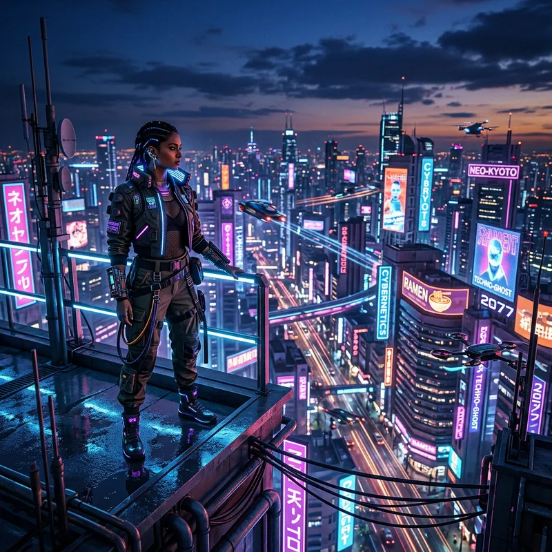 A futuristic cityscape at dusk, enveloped in the glow of neon lights that draws inspiration from the vibrancy of Tokyo's nightlife. Atop a high-rise building, an South Asian woman is standing, donned in cyberpunk-inspired clothing. The scene captures the essence of cyberpunk aesthetics, with an array of vibrant colors and dynamic lighting. A wide-angle perspective is used to emphasize the sprawling cityscape beneath.