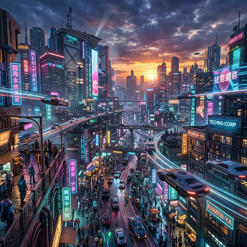 Visualize a futuristic cityscape at sunset, defined by the radiant glow of neon lights that is characteristic of cyberpunk aesthetics. The scene reveals bustling streets abuzz with flying cars. Use a wide-angle lens perspective to encapsulate the expansive splendour of the cityscape and the dynamic life it hosts. The encompassing image should evoke a strong sense of a high-tech city navigating its own rhythmic flow in the cybernetic era.
