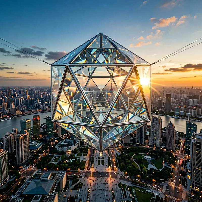 Visualize a massive icosahedron made of clear glass suspended in midair, demonstrating a captivating interplay of light and reflections. This should reflect the principles of minimalist geometric art, placing focus on symmetry and clean lines. The angle should resemble that of a high-altitude drone shot, emphasizing the grand scale of the geometric structure. It is to be seen as a futuristic installation, with light gleaming and refracting off the prismatic faces.